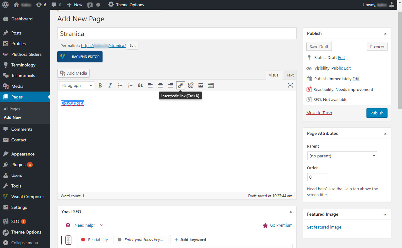 Upišemo tekst koji će nam služiti kao poveznica na dokument, ounačimo ga i kliknemo na ikonicu Insert/Edit link.