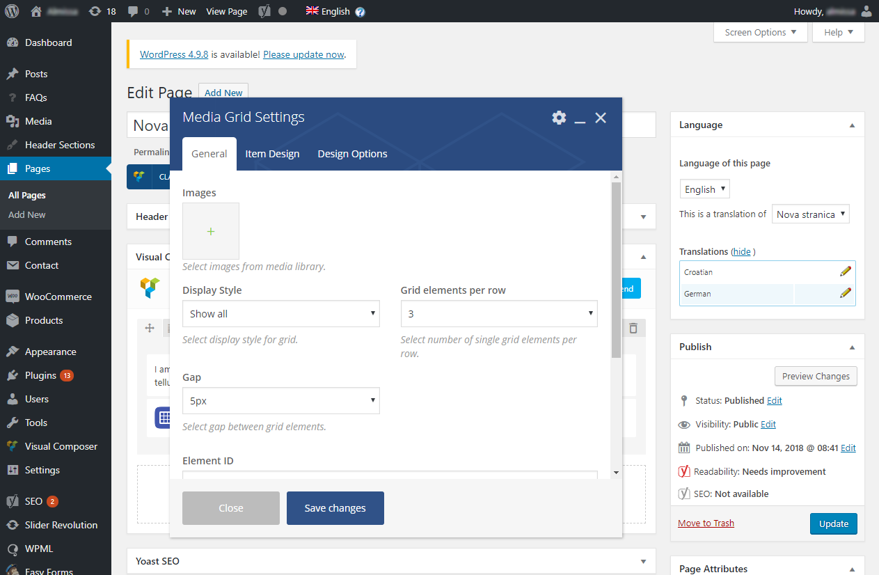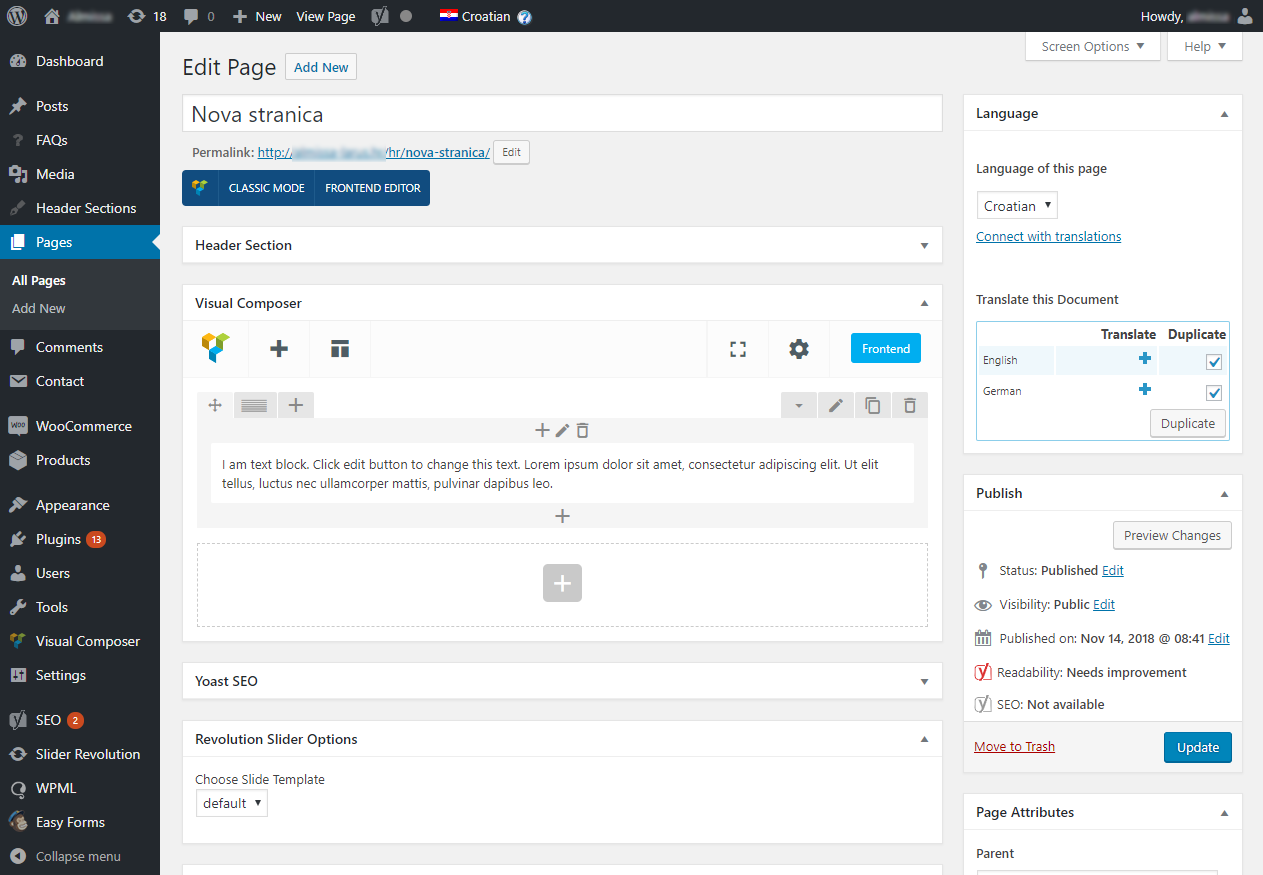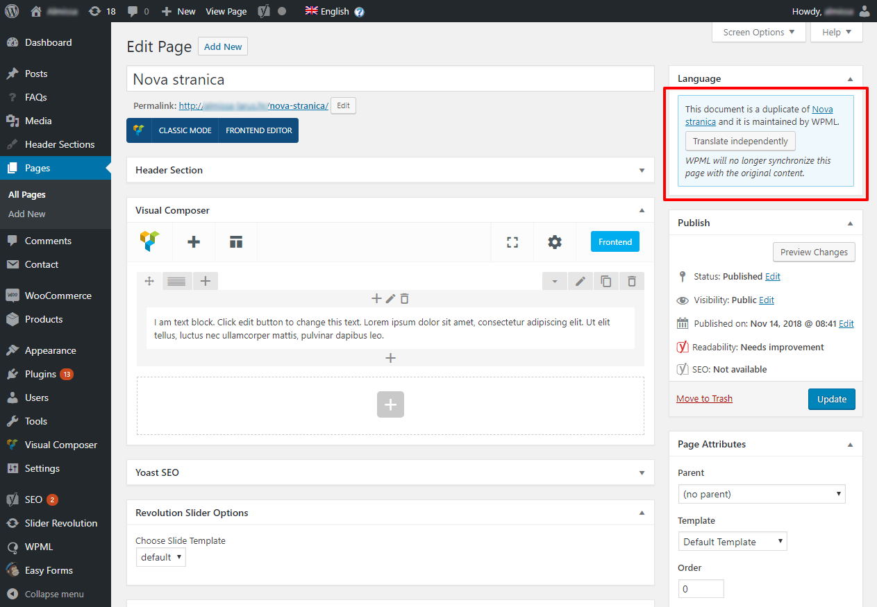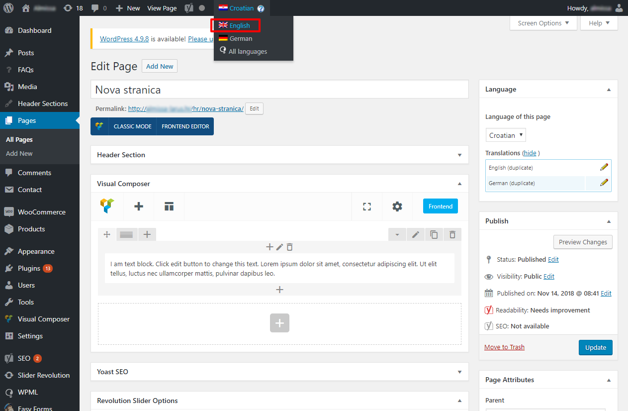 Stranicu prevodimo tako da u desnom stupcu pod Language označimo jezike na koje ćemo kopirati cijeli sadržaj trenutnog jezika i kliknemo Duplicate. Ovo je jednostavniji način zbog toga što će se kopirati cijela struktura VisualComposera za datu stranicu i nećemo morati iznova slagati elemente, nego samo izmijeniti tekstove. Slike unutar sadržaja stranice nećemo trebati mijenjati, jedino ćemo iznova trebati unijeti Featured image ukoliko prevodimo postove jer se on ne kopira.