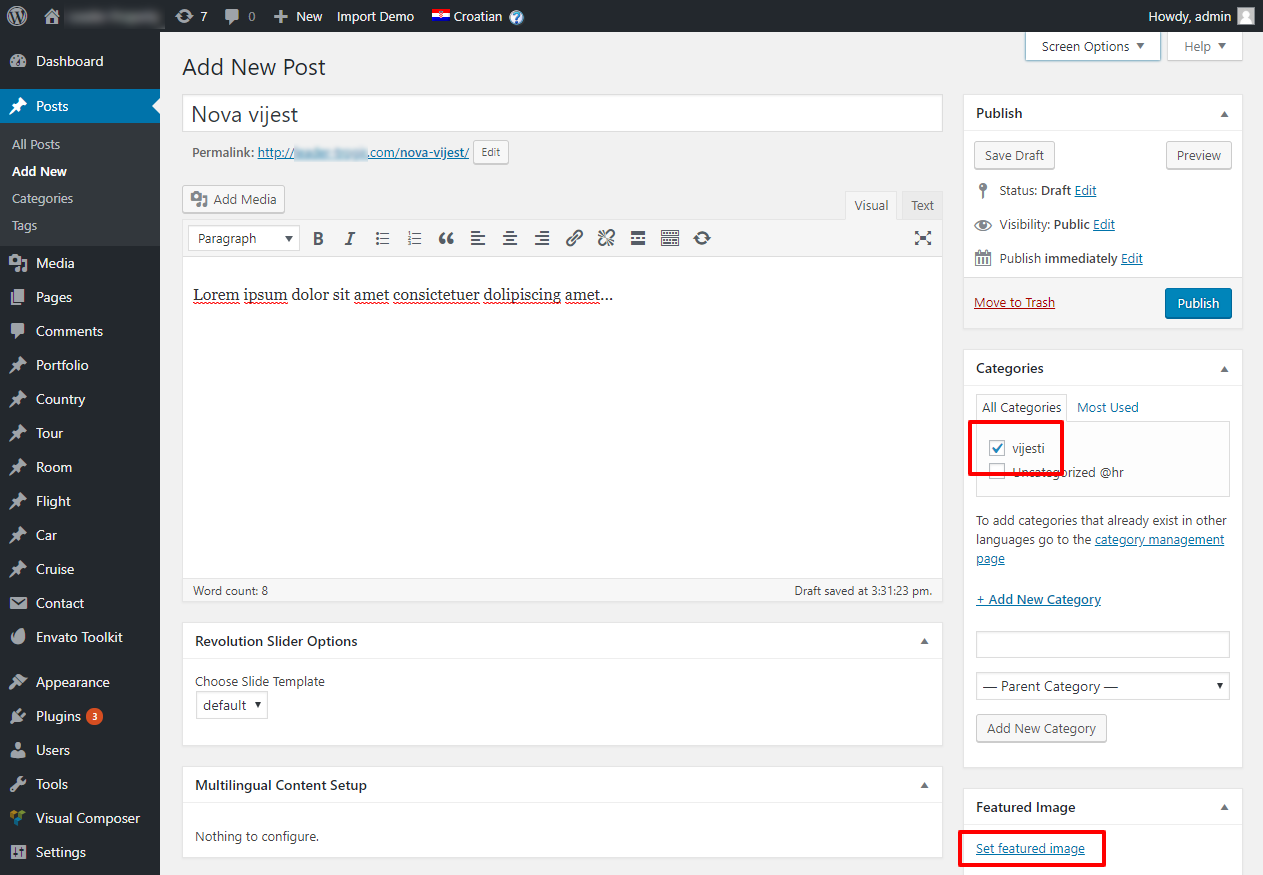 Zato kad dodajemo vijest, uz naslov i sadržaj, dodaje se i kategorija u desnom stupcu. Također, za