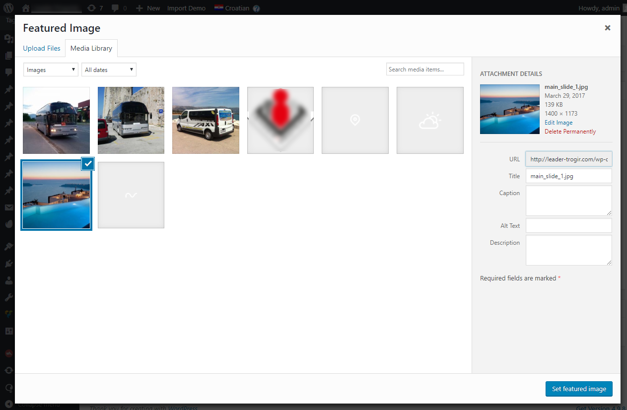 tako da se klikne na Set featured image i odabere slika iz Media library ukoliko je