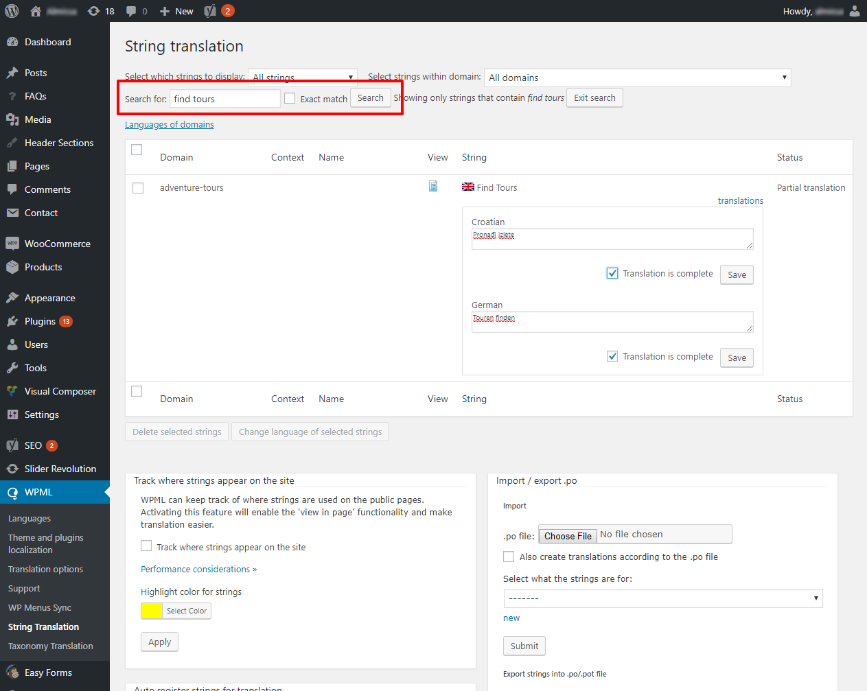 odemo na Menu > WPML > String translation. Na toj stranici u naznačeno input polje