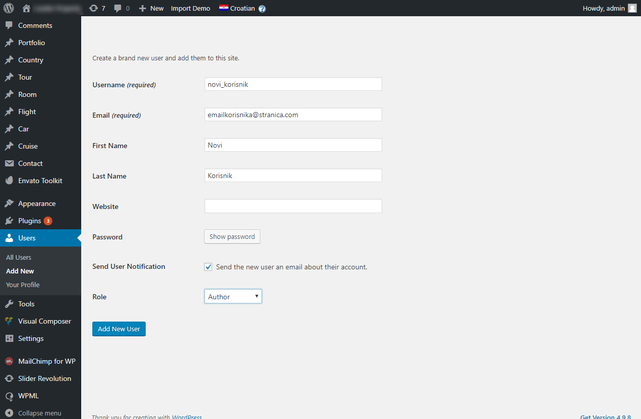 U meniju odaberemo Users da bismo došli do administracije korisnika gdje ih možemo dodavati, mijenjati i brisati postojeće, odn. Menu > Users > Add new ukoliko želimo odmah dodati novog korisnika. Popunimo tražena polja, dodijelimo u ulogu (Role) iz padajućeg izbornika (Administrator ima sve ovlasti, za nekoga tko će uređivati sadržaj dovoljno je Author ako će dodavati i izmijenjivati sadržaj, odn. Editor ako će samo izmijenjivati postojeće sadržaje) i kliknemo na botun Add new user. Novi korisnik sada će se pojaviti u izlistu svih postojećih korisnika.