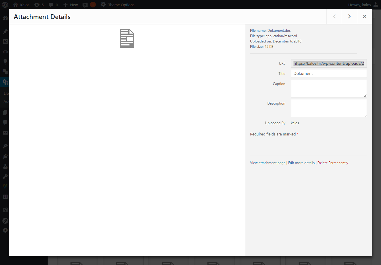Prvo moramo dodati željeni dokument u Media Library (Menu > Media) i tu ga dodamo na isti način kao i sliku - Drag&Drop metodom. Nakon što se dokument uploadao, kliknemo na njega i iskočit će nam prozor kao na sljedećoj slici.