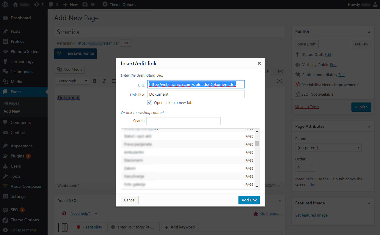 Kada nam iskočii novi prozor u polje URL zalijepimo kopirani tekst od maločas (Ctrl + V ili desni klik > Paste), i zatim označimo kvačicom polje Open link in a new tab. Kliknemo Add link botun i zatim Publish ili Update botun na stranici, ovisno o tome da li je stranica tek kreirana ili uređujemo postojeću.