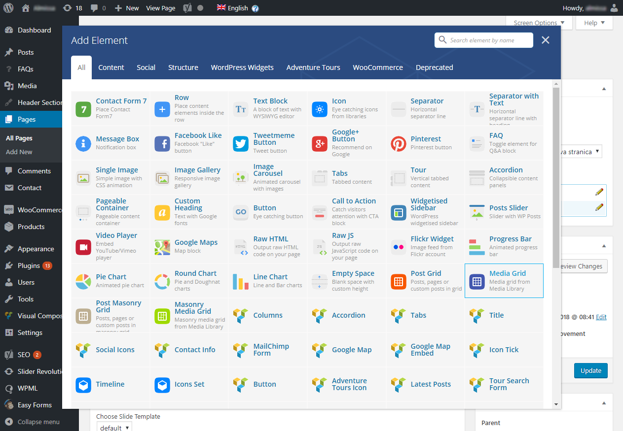 Unutar VisualComposer Row-a kliknemo na "+" botun da bismo iz popup prozora izabrali željeni modul. Za galeriju na raspolaganju imamo nekoliko solucija - Image gallery, Image carousel, Media grid i Masonry media grid, a ovisno o temi možda i još poneka. Princip svake je da se dodaju slike i podesi nekoliko parametara. Za primjer uzimamo Media grid koji prikazuje po nekoliko sličica u redu i klikom na pojedinu otvara veci prozor s tom slikom i kontrolama naprijed-nazad.