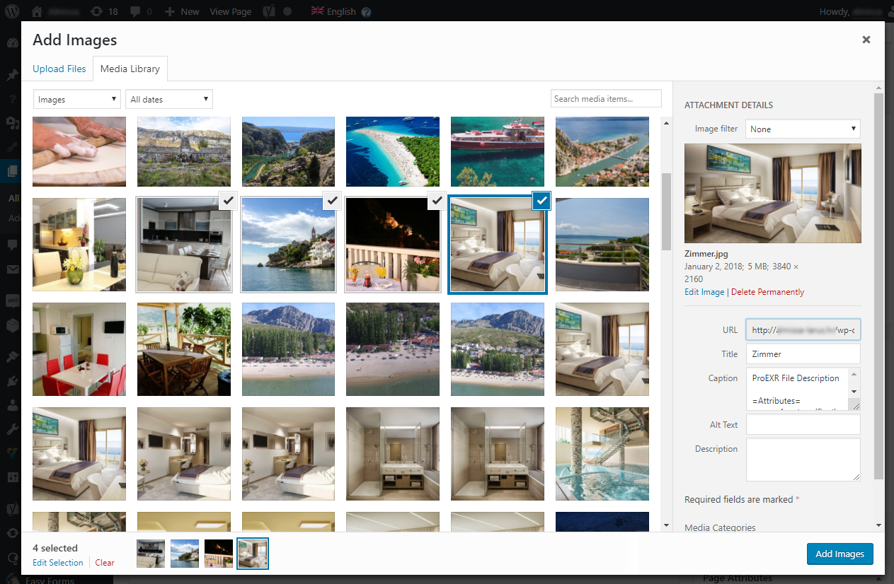 Tada nam se otvara Media library iz koje označimo koje slike želimo dodati u galeriju, odn. uploadamo ih Drag&drop metodom (odvučemo ih mišem iz mape na računalu i otpustimo u prozor Media library-a). Kada se slike uploadaju, kliknemo na Add images. To nas vraća na prethodni prozor gdje slikama koje se sada tu pojave možemo mijenjati raspored ukoliko želimo i zatim kliknemo Save changes da bismo sačuvali galeriju, a zatim i Update/Publish da bismo sačuvali cijelu stranicu.