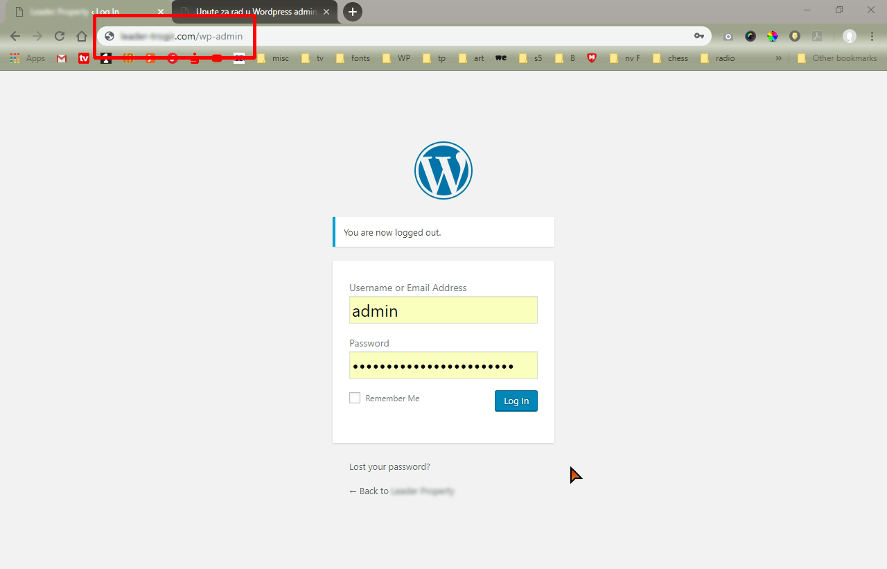 Upišemo adresu za login u Wordpress administraciju (vašadomena.com/wp-admin), unesemo username i password i kliknemo na Log in.
