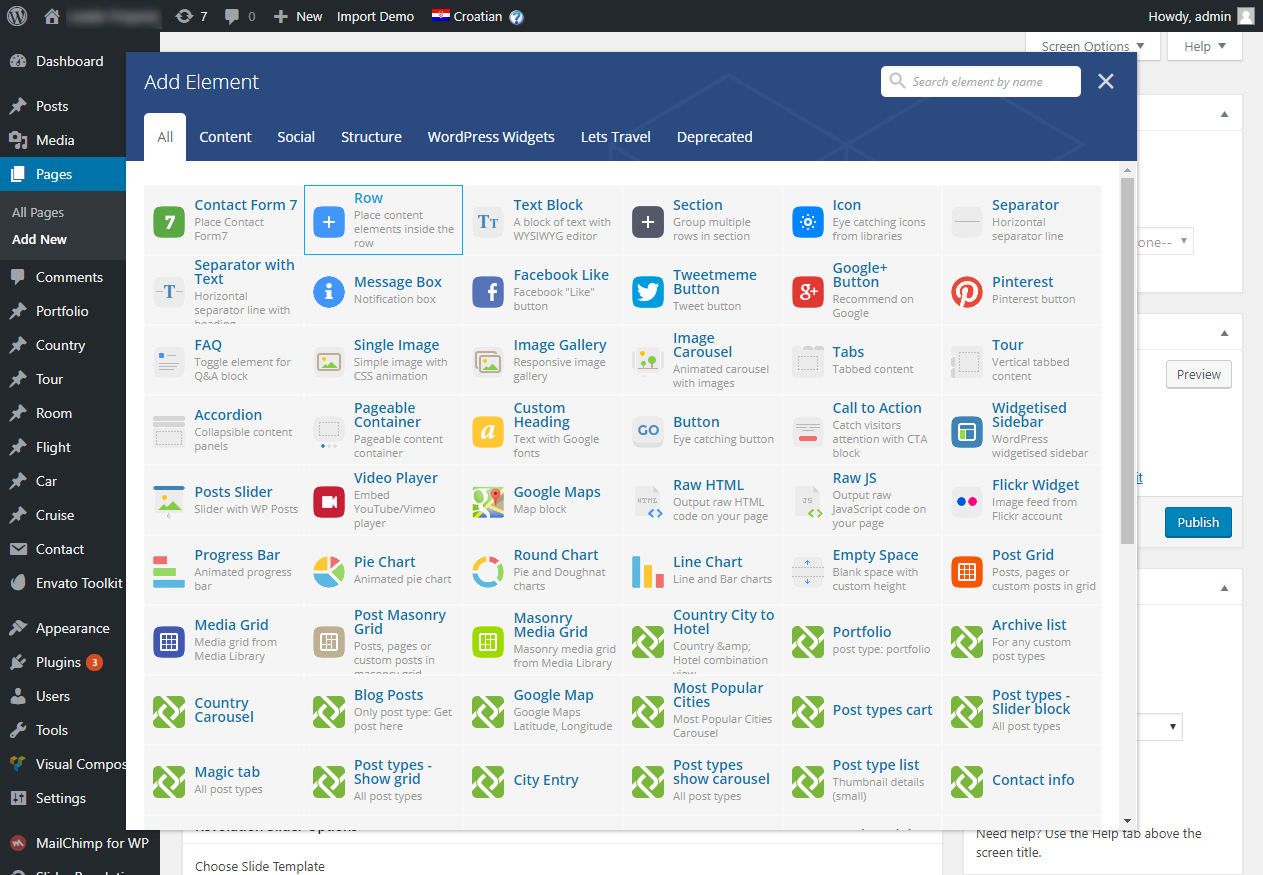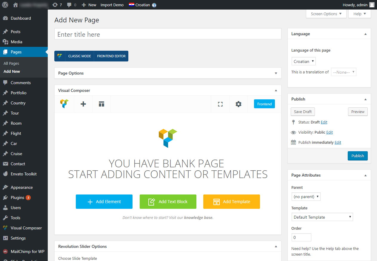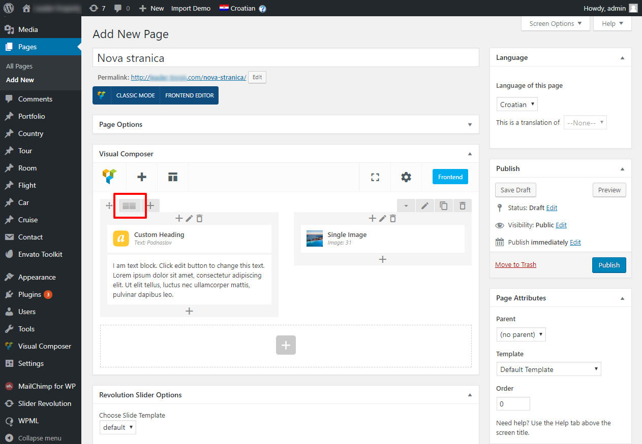 Nakon što smo kliknuli na Add page krećemo s uređivanjem sadržaja te stranice. Prvo unesemo naziv nove stranice u prvo polje za unos (Enter title here). Ukoliko tema koristi VisualComposer krećemo s dodavanjem elemenata (ako ne koristi VC tu će biti tekstualni editor u kojeg direktno upisujemo tekst). Kliknemo na + Add element botun da se pojavi prozor s dostupnim modulima, iz kojega prvo odabiremo Row. On služi kao ploča na kojoj slažemo elemente.